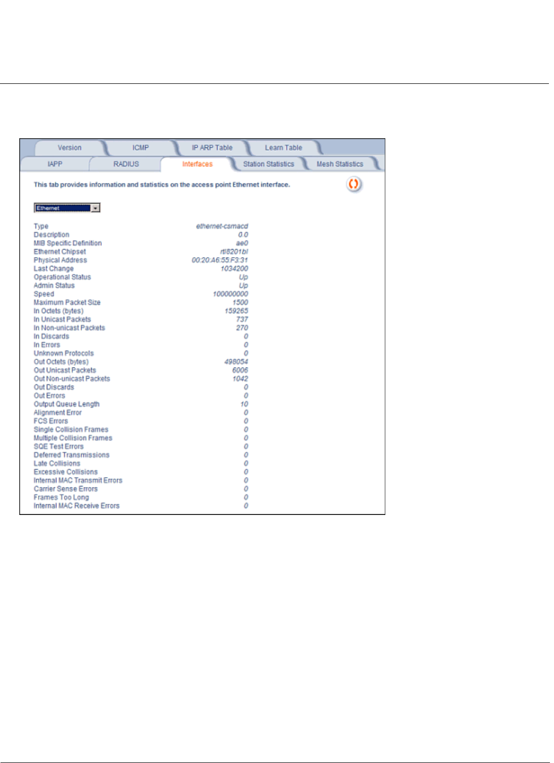 This tab displays statistics for the Ethernet and wireless interfaces.