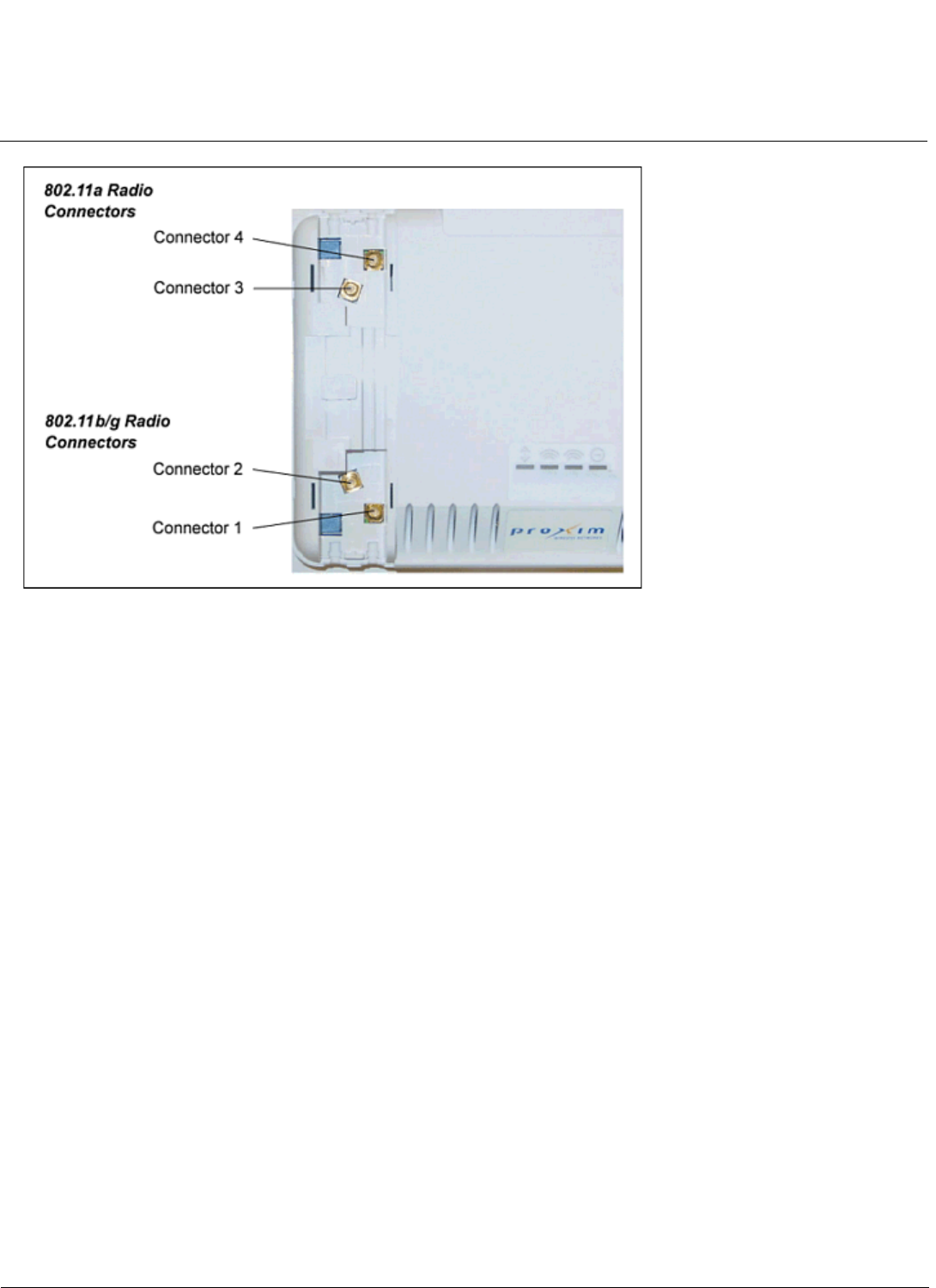Connectors 1 and 2 are for the 802.11b/g radio; connectors 3 and 4 are for the 802.11a radio. When the AP is mounted