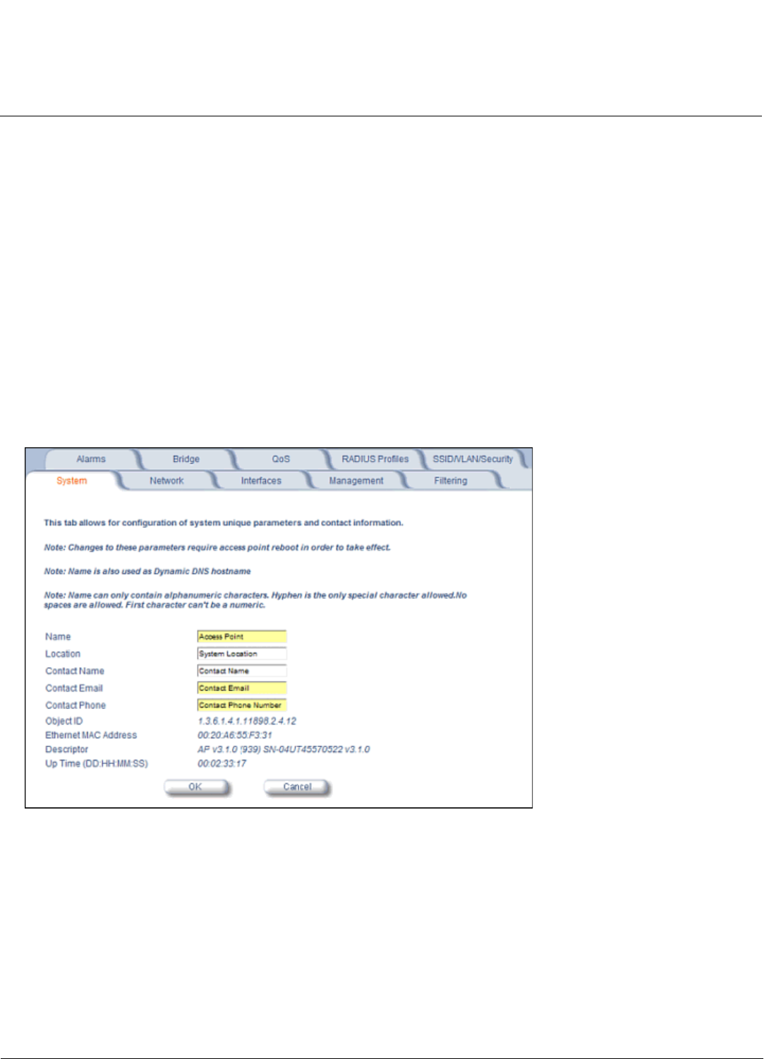 • Name: The name assigned to the AP. See the Dynamic DNS Support and Access Point System Naming Convention