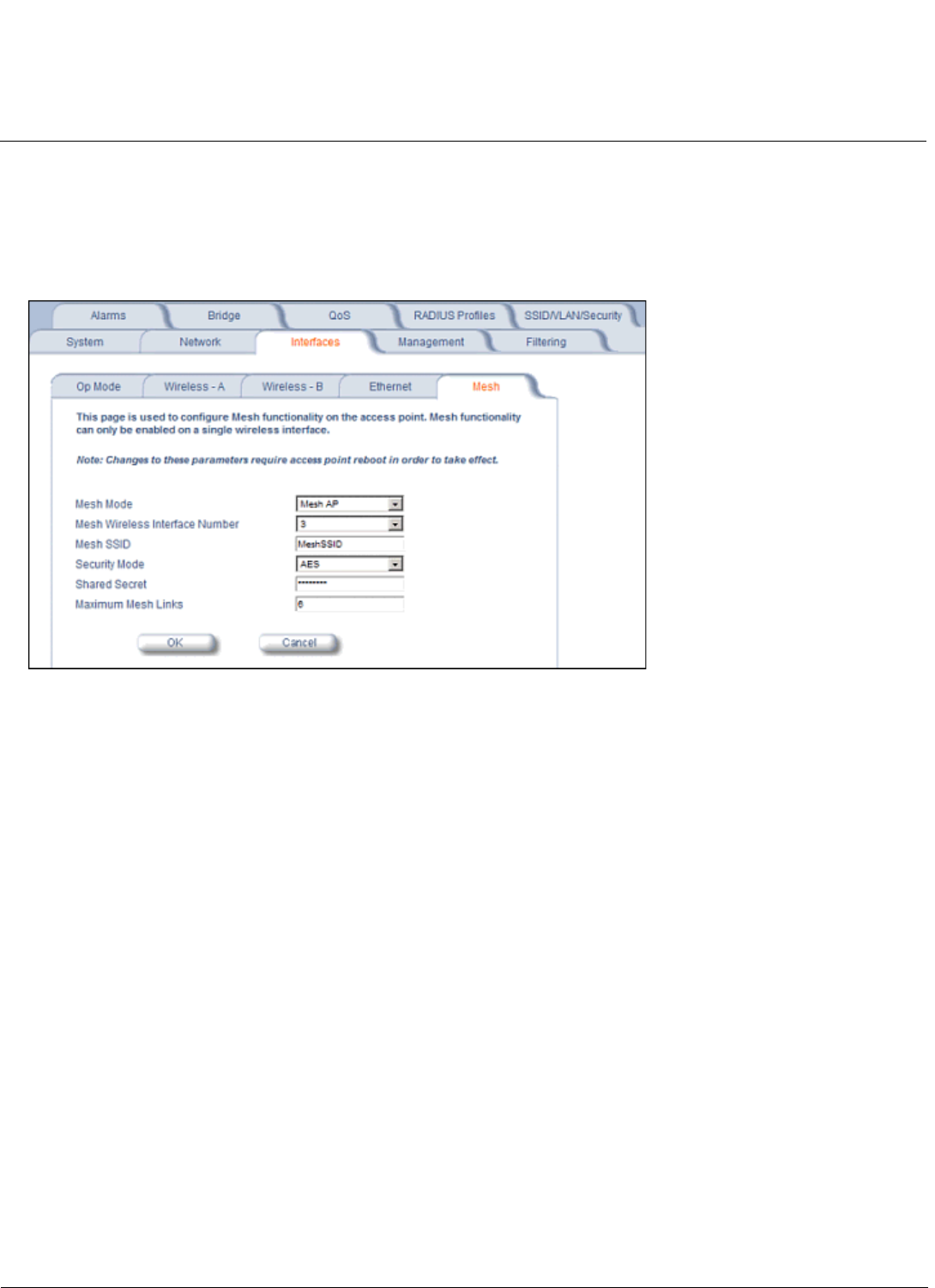 Mesh functionality can be enabled on only one of the AP’s wireless interfaces. When configured for Mesh, the AP’s