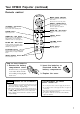 Your DP5800 Projector (continued) Remote control MENU STICK SWITCH Selects or adjusts the menu items in Menu mode. Works as the mouse in Play mode. RESET / RIGHT button STANDBY / ON button Power ON/OFF button. OFF sets the unit in Standby mode. Resets menu items to factory settings when menus are open. Works as right mouse button in Computer mode. RIGHT RIGHT RISET RESET STANDBY/ON MENU ON / OFF button MENU ZOOM button Displays or removes the on-screen menus. Adjusts picture size.