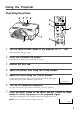 Using the Projector Projecting the picture 4 2 7 5 2 RIGHT RISET RESET STANDBY/ON MENU 4 ZOOM 5 FOCUS VOL TIMER BLANK 1 7 POSITION MUTE VIDEO1/2 RGB1/2 3 INPUT 1 Turn the MAIN POWER switch of the projector on. [ : ON] • The ON indicator will glow orange. 2 Press the STANDBY/ON button. • The ON indicator blinks (green) and then glows (green). 3 Remove the lens cap. 4 Adjust the picture size using the ZOOM buttons. 5 Adjust the focus using the FOCUS buttons.
