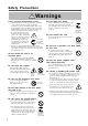 Safety Precautions Warnings If any unusual performance occurs. • • • An abnormal smell or smoke may indicate the possibility of fire or electric shock, etc. When any unusual performance is observed, immediately turn off the power switch and pull out the power plug from the power outlet. Check that there is no smoke, etc., and then contact your dealer to repair the unit. Do not repair it yourself .