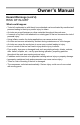 Owner’s Manual Compressor (cont’d) TROUBLE SHOOTING (cont’d) Excessive starting and stopping, while not in use • Fittings leak Check fittings with soapy water. Tighten or reseal leaking fittings. DO NOT OVERTIGHTEN. Replace worn parts and reassemble with new seals. Replace any regulator internal parts. • Regulated pressure gauge reading drops when air accessory is being used.