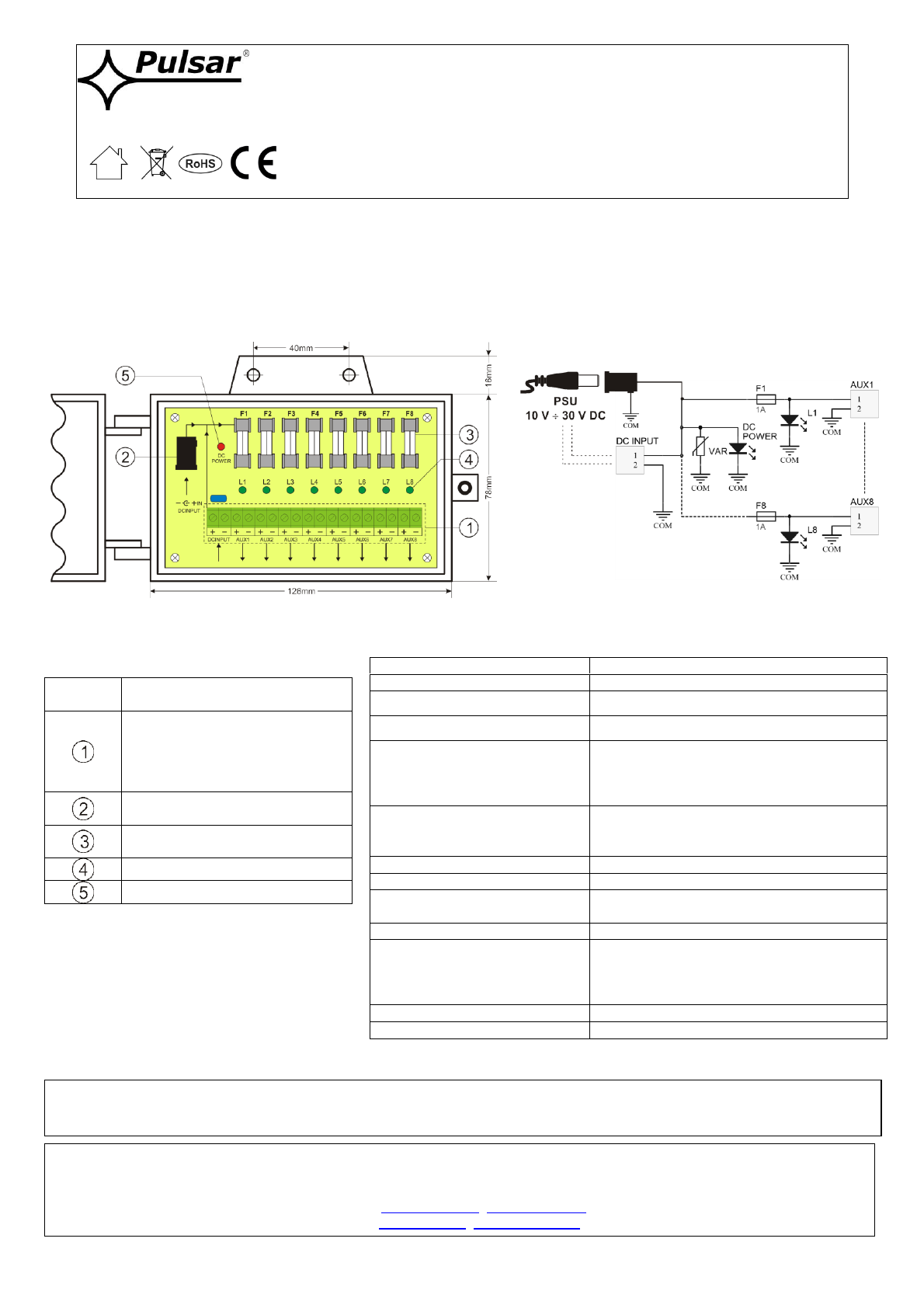 outputs independently protected with 1A melting fuses. PTC fuse activation is indicated by switching off the