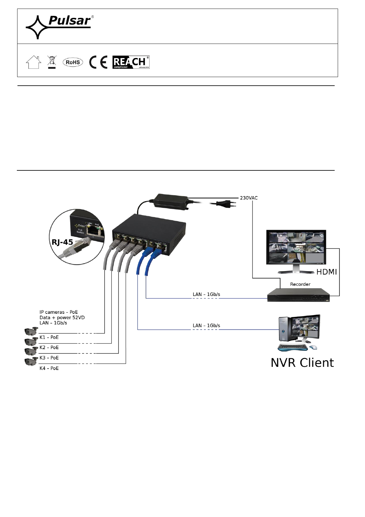 detection of any devices powered in the PoE/PoE+ standard is enabled at the 1 – 4 ports of the switch. The UP LINK ports is