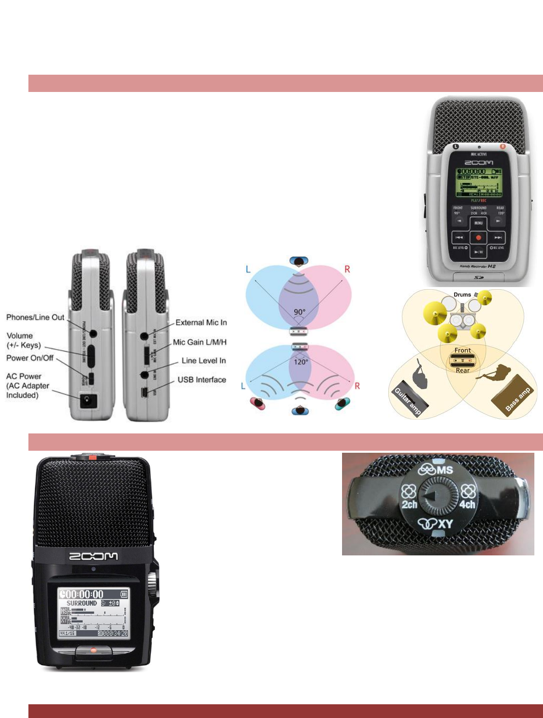 Record from the front of the H2 in a 90° pickup pattern or the rear of the H2