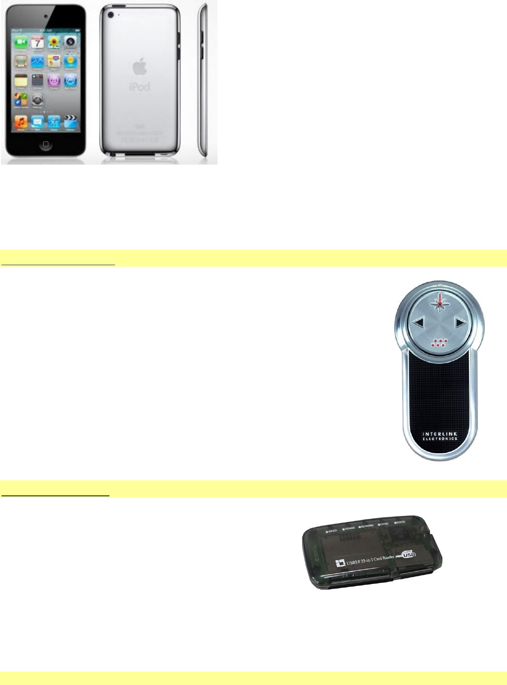 MMCmicro; CF Type I and II, Microdrive; MemoryStick, Memory Stick Pro, Memory Stick Duo, Memory