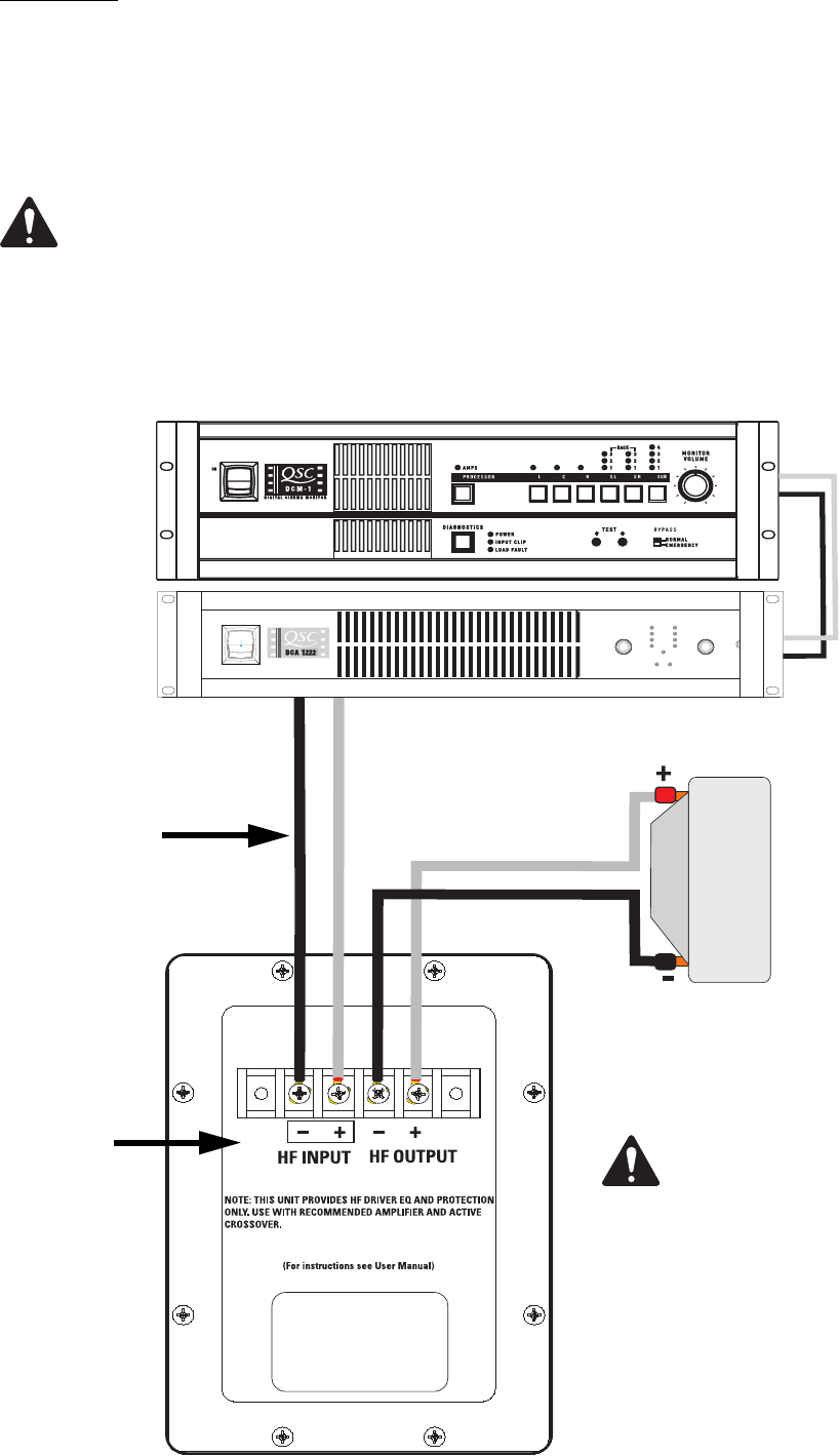 Conecte la señal de salida del amplificador en los terminales de ENTRADA de HF del altavoz. Observe la polaridad adecuada; ampli-