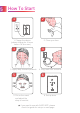 11 How To Start 1 2 1. Charge the device (please charge for 4 hours before 1st time use) 3 2. Clean your face 4 3. Apply daily skincare products 4. Plug mask into controller 5 6 5. Put on the mask, and adjust the strap to comfort 6.