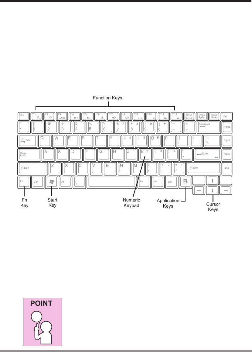 Your notebook has an integral 87-key keyboard. The keys perform all the standard