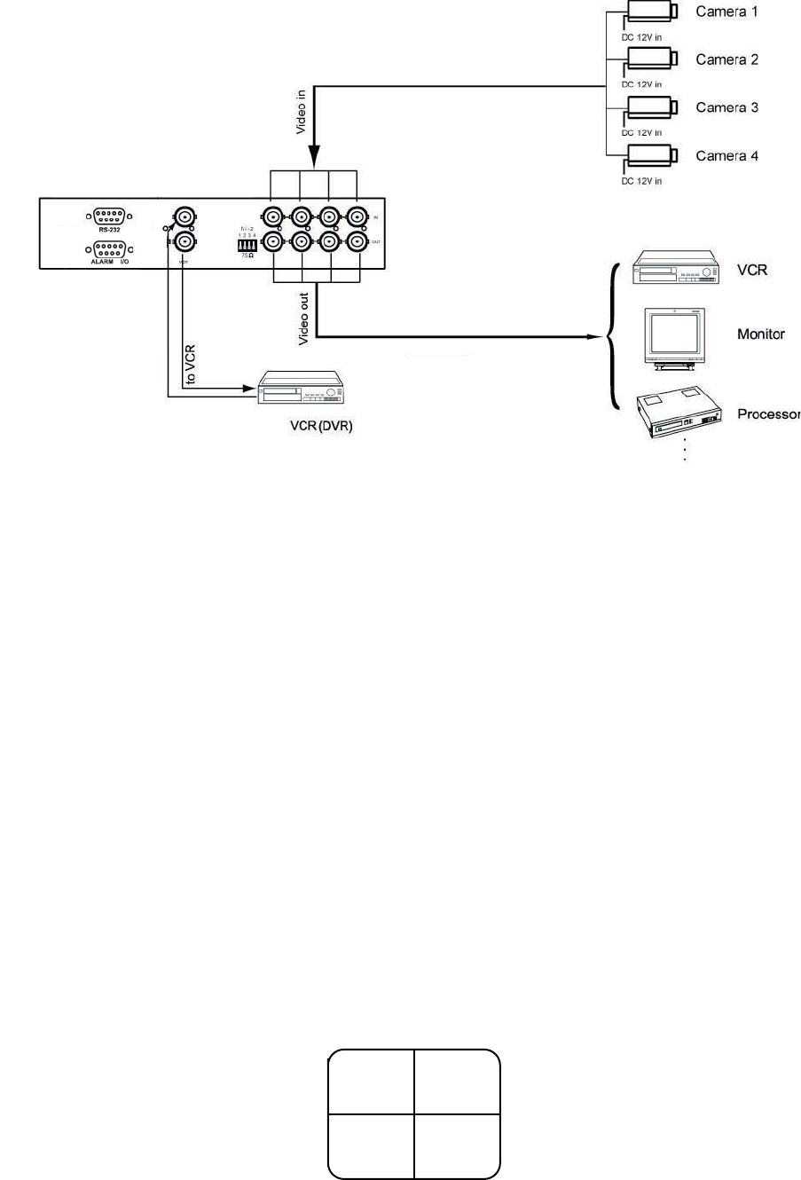 This BNC connector is connected to video output from VCR/DVR. A pre-recorded quad screen signal from a tape can be