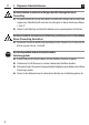 i 5. Allgemeine Sicherheitshinweise D Bei allen Arbeiten an elektrischen Anlagen besteht Lebensgefahr durch Stromschlag. ◆◆ Der elektrische Anschluss und alle Arbeiten an elektrischen Anlagen müssen durch eine zugelassene Elektrofachkraft nach dem Anschlussplan in dieser Anleitung erfolgen, s. Seite 17. ◆◆ Führen Sie alle Montage-und Anschlussarbeiten nur im spannungslosen Zustand aus. Der Einsatz defekter Geräte kann zur Gefährdung von Personen und zu Sachschäden führen (Stromschlag, Kurzschluss).