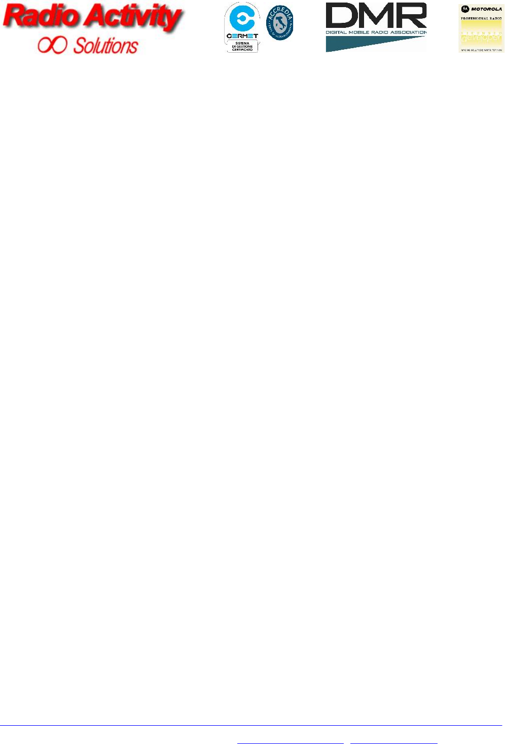 DMR_Manager Operating Manual Version 1v2 Radio Activity S.r.l. Headquarter: Via Ponte Nuovo, 8 - 20128 Milano - Italy – email: radio.activity@fastwebnet.it - www.radioactivity-tlc.it Phone 02.36514205 - FAX/Voicebox 1782242408 - Registrazion CCIAA Milano N° 1728248 - P.I./C.F.