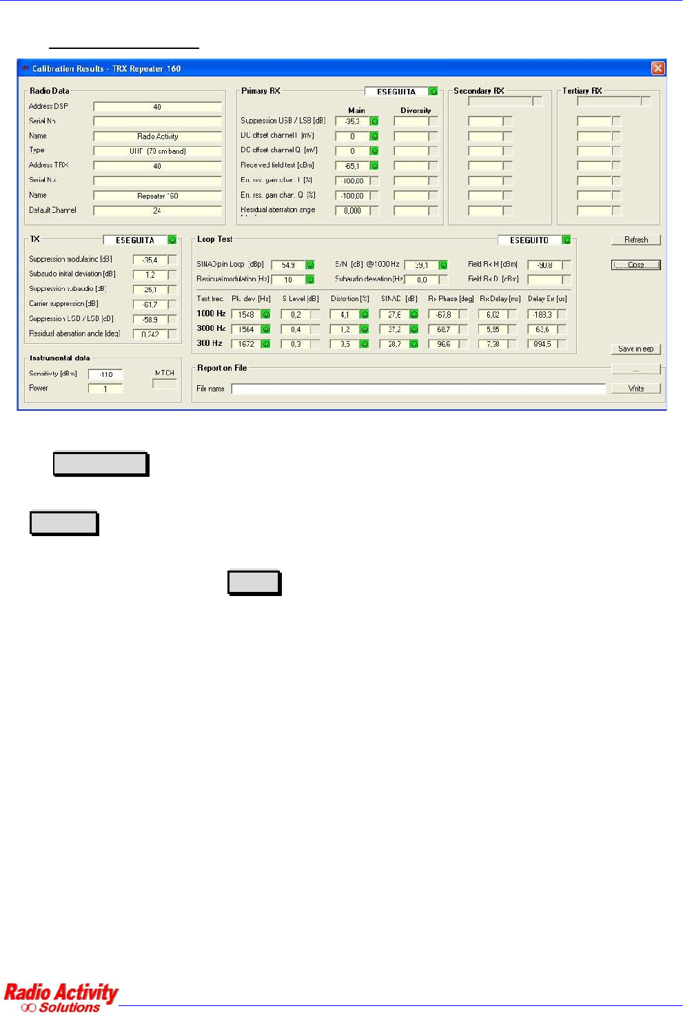 This form displays the calibration results (TX,RX and loop test).