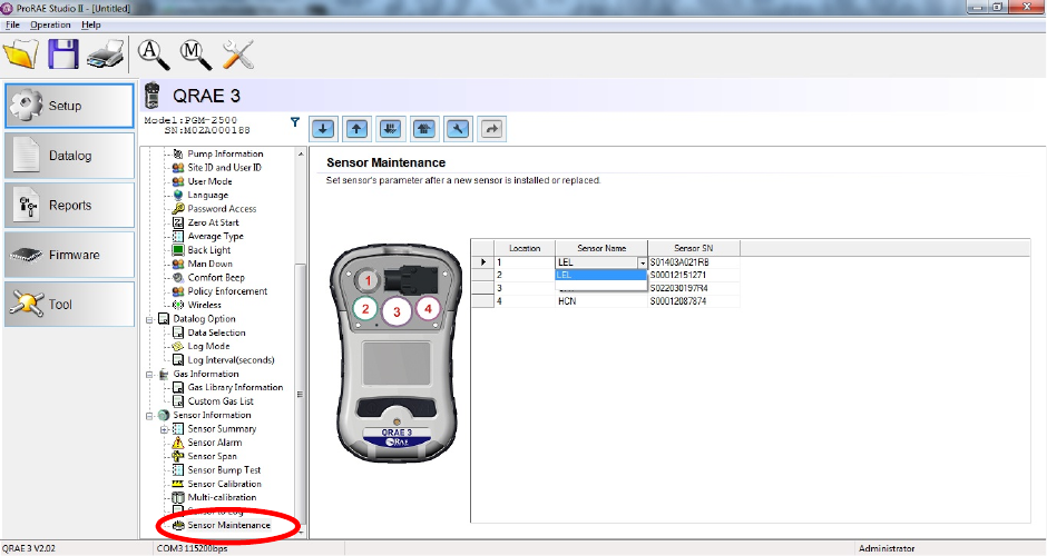c. Start ProRAE Studio II on the PC and go into Setup >> Sensor Maintenance to do the