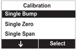 Each bump test or calibration option shows a countdown followed by sensor reading and