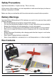 Safety Precautions Age Recommendation; 14 years and up. This is not a toy. As the owner of this airplane, you are responsible to make sure that injury to others or damage to property is avoided. Make sure that you are familiar with the entire instruction manual before operation. Battery Warnings Important Notice: Mishandling of LiPo batteries can result in fire, personal injury and/or property damage! • Ensure that batteries are properly charged before flying.