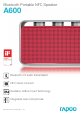 Bluetooth Portable NFC Speaker A600 The A600 makes for an impressive sight with its minimalist design in a high-grade aluminum enclosure. This gives the speaker a nice quality weight and also forms the casing of the actual speaker unit which is available in 5 colors. The integrated Li-ion battery is rechargeable via micro USB and packs enough power for around 10 hours of uninterrupted music pleasure, which is greatly enhanced by the Radiation Airflow Technology.