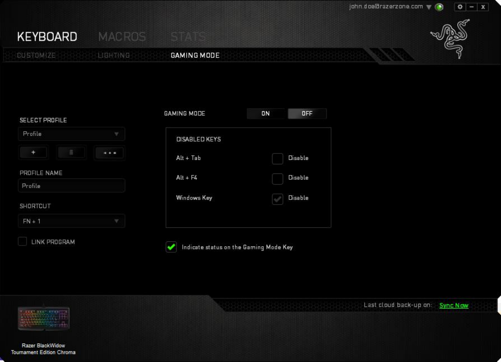 The Gaming Mode Tab allows you to customize which keys to disable when Gaming