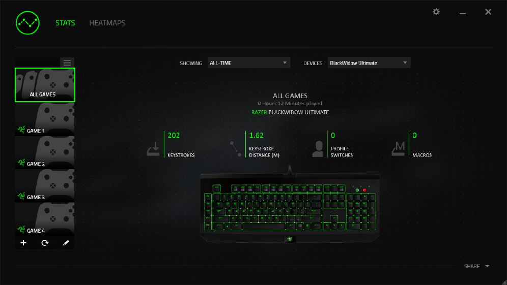 By default, the Stats Tab shows you the overall statistics of all your Razer devices for all