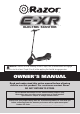 ELECTRIC SCOOTER NOTE: The unit must be traveling at least 3 mph (5 km/h) before motor will engage. Kick to start to at least 3 mph (5 km/h) while applying the throttle to engage motor. OWNER’S MANUAL Read and understand this entire manual before allowing child to use this product! For assistance contact Razor. DO NOT RETURN TO STORE. NOTE: Manual illustrations are for demonstration purposes only. Illustrations may not reflect exact appearance of actual product.