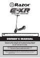 ELECTRIC SCOOTER NOTE: The unit must be traveling at least 3 mph (5 km/h) before motor will engage. Kick to start to at least 3 mph (5 km/h) while applying the throttle to engage motor. OWNER’S MANUAL Read and understand this entire manual before allowing child to use this product! For assistance contact Razor. DO NOT RETURN TO STORE. NOTE: Manual illustrations are for demonstration purposes only. Illustrations may not reflect exact appearance of actual product.