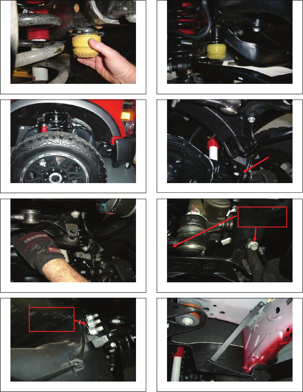 Reinstall wheels/tires, lower vehicle and torque to spec. .(05-10) Re-attach and tighten sway bar end links.