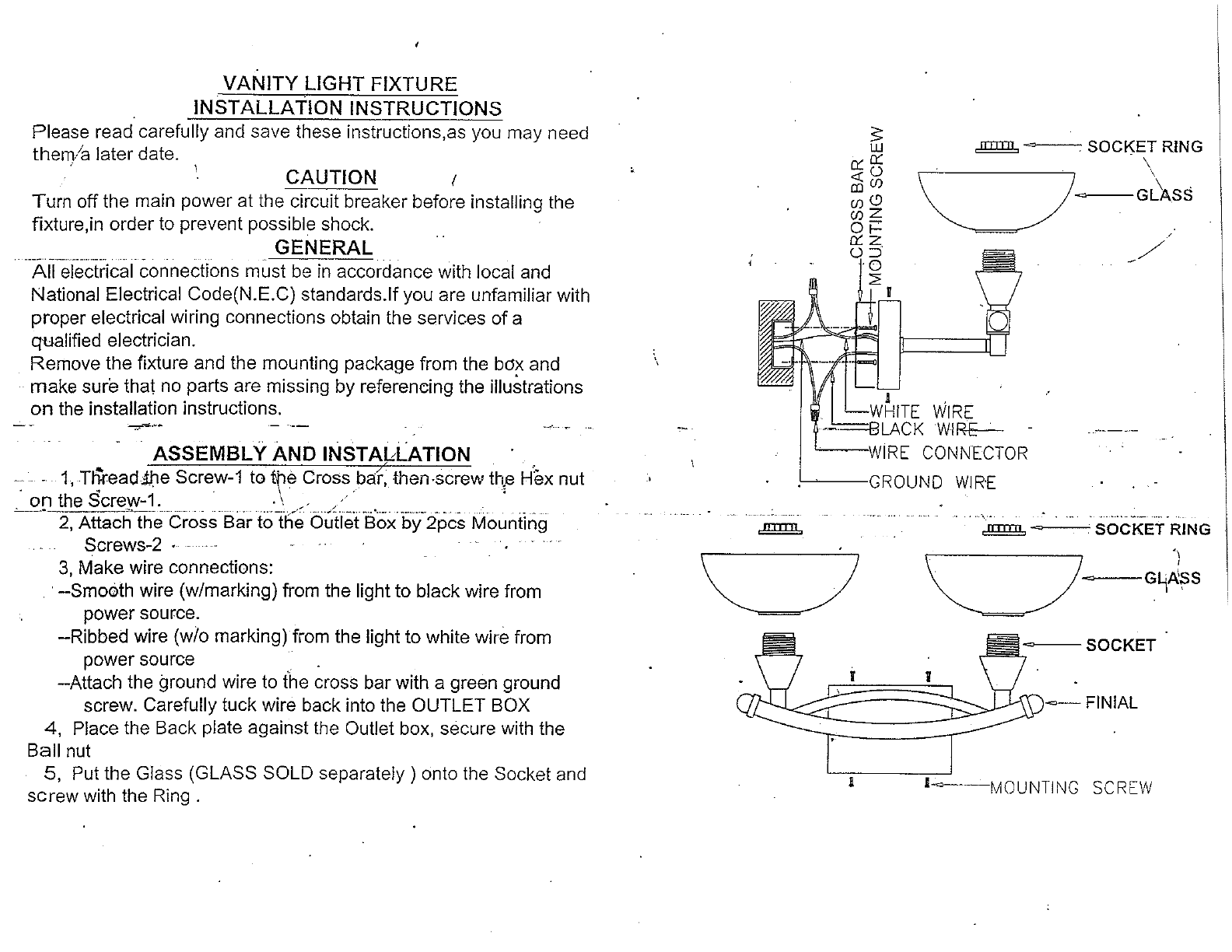 . VANITY LIGHT FIXTURE INSTALLATION INSTRUCTIONS Please read carefully and save these instructions,as you may need them/a later date. : CAUTION ‘ Turn off the main power at the circuit breaker before installing the fixture,in order to prevent possible shock. . _GENERAL "All electrical connections must be in accordance with local and National Electrical standards.If you are unfamiliar with proper electrical wiring connections obtain the services of a qualified electrician.