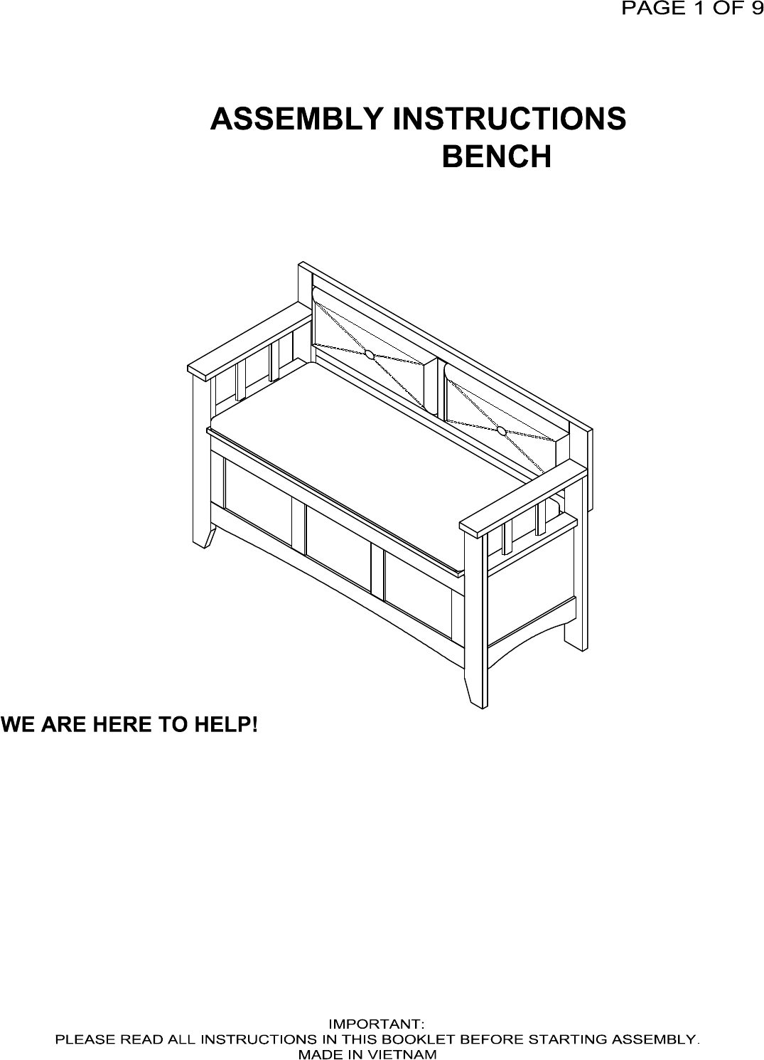PAGE 1 OF 9 BENCH ASSEMBLY INSTRUCTIONS WE ARE HERE TO HELP! IMPORTANT: PLEASE READ ALL INST! MADE IN VIETNAM