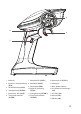 18 16 19 17 1 Abdeckung 7 Steuerwinkel D/R (ST.D/R -) 2 Schalter zur Lenkungsumkehrung 8 (ST.RV) 9 3 LED-Betriebsanzeige (R.LED) 10 4 Lenkungstrimmung (ST.TRIM -) 13 Steuerwinkel D/R (ST.D/R +) Netzschalter (ON/OFF) 14 Aufhängeöse Kopplungstaste (BIND) 15 Basis / Batterie-/Akkufach Umkehr der Gasrichtung (TH.REV) 16 AUX-Schalter mit drei Stellungen (CH3) 5 Statusanzeige: Grün (G.LED) 11 Lenkungstrimmung (ST.TRIM +) 17 AUX-Taste (CH4) 6 Trimmung des Gashebels (TH.