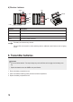 b) Receiver / antenna Signal + - VCC CH4 CH3 CH2 Antenna GND CH1 LED LED Channel Description CH1 Steering servo CH2 Throttle servo CH3 AUX servo CH4 AUX servo / battery connector v The battery can connect to any channel. CH3 and CH4 can be used for various switching tasks or additional control functions such as lighting circuits. 8. Transmitter batteries Important • Do not use lithium batteries. The output voltage may not be sufficient and can trigger the low battery warning.