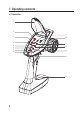 18 16 19 17 1 Panel cover 8 Power switch (ON/OFF) 15 Base / battery compartment 2 Steering reverse switch (ST.RV) 9 Bind button (BIND) 16 Three-position AUX switch (CH3) 3 Power indicator LED (R.LED) 10 Throttle reverse (TH.REV) 17 AUX button (CH4) 4 Steering trim (ST.TRIM -) 11 Steering trim (ST.TRIM +) 18 Steering wheel (CH1) 5 Status indicator: Green (G.LED) 12 Throttle trim (TH.TRIM +) 19 Throttle lever (CH2) 6 Throttle trim (TH.TRIM -) 13 Steering D/R (ST.D/R +) 7 Steering D/R (ST.