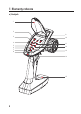 b) Odbiornik/antena Sygnalizacja + - VCC CH4 CH3 CH2 Antena GND CH1 LED LED Kanał Opis CH1 Serwomechanizm sterujący CH2 Serwomechanizm dławiący CH3 Serwomechanizm AUX CH4 Serwomechanizm AUX/złącze baterii v Baterię można podłączyć do dowolnego kanału. CH3 i CH4 mogą służyć do różnych zadań przełączania lub dodatkowych funkcji sterowania, np. obwodów oświetleniowych. 8. Baterie nadajnika Ważne • Nie używaj baterii litowych.