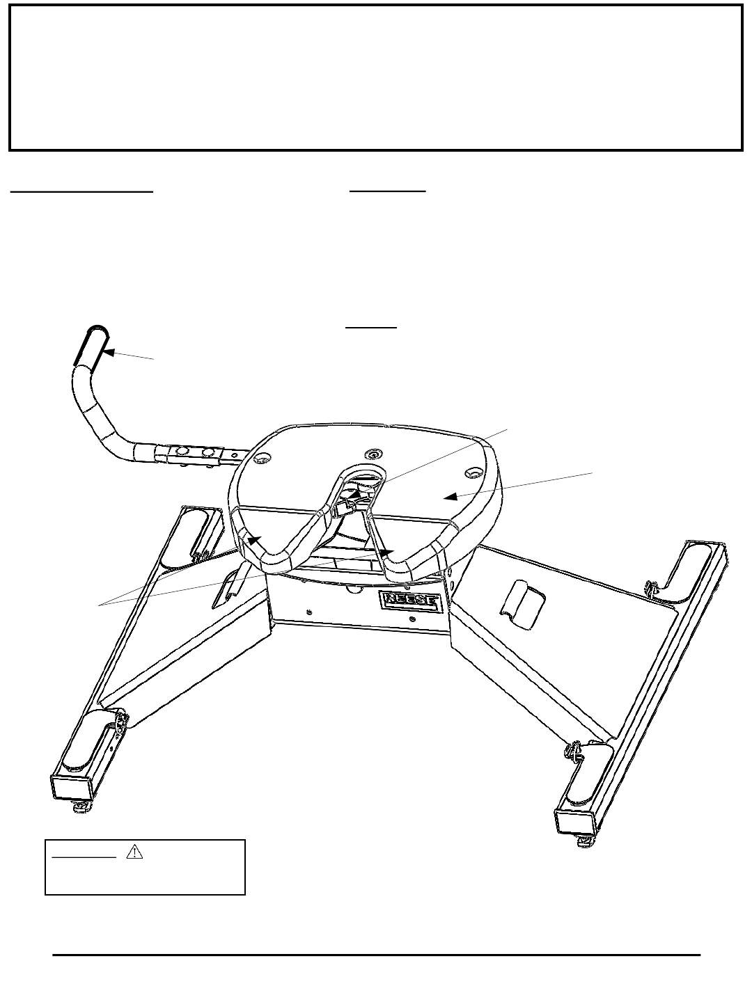 OPERATING INSTRUCTIONS PART NUMBER 30160 Reese RAM 20K 5TH WHEEL HITCH END USER: DEALER/INSTALLER: 1. 2. 3. Provide this Manual to end user. Physically demonstrate hitching and unhitching procedures in this Manual to end user. Have end user demonstrate that he/she understands procedures. HITCH HANDLE 1. 2. 3. 4. Read and follow this Manual every time you use hitch. Save this Manual and Hitch Warning Hang Tag for future reference.