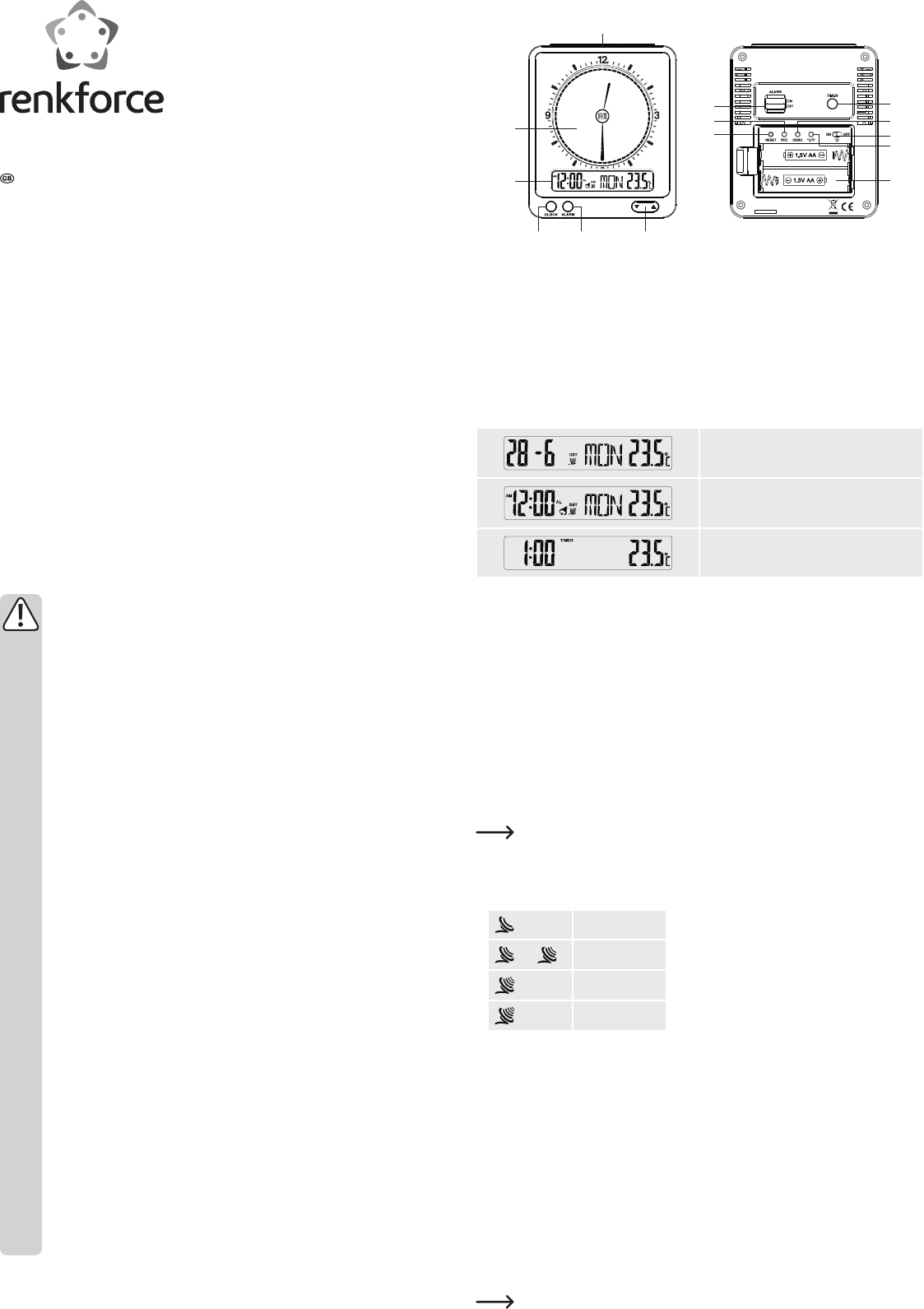day can be set automatically by radio signal or manually. The product also features an alarm