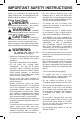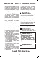 IMPORTANT SAFETY INSTRUCTIONS • Use only extension cords that are rated for outdoor use. Extension cords in poor condition or too small in wire size can pose fire and shock hazards. To reduce the risk of these hazards, be sure the cord is in good condition and that liquid does not contact the connection. Do not use an extension cord with conductors smaller than 1,3 mm2 (16 AWG). • This Wet/Dry Vac is double-insulated, eliminating the need for a separate grounding system.