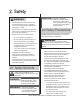 2. Safety CAUTION WARNING • If the information in these instructions is not followed exactly, a fire or explosion may result causing property damage, personal injury, or death. • Do not store or use gasoline or other flammable vapors and liquids in the vicinity of this or any other appliance. • WHAT TO DO IF YOU SMELL GAS: – Do not try to light any appliance. – Do not touch any electrical switch; do not use any phone in your building. – Immediately call your gas supplier from a neighbor’s phone.