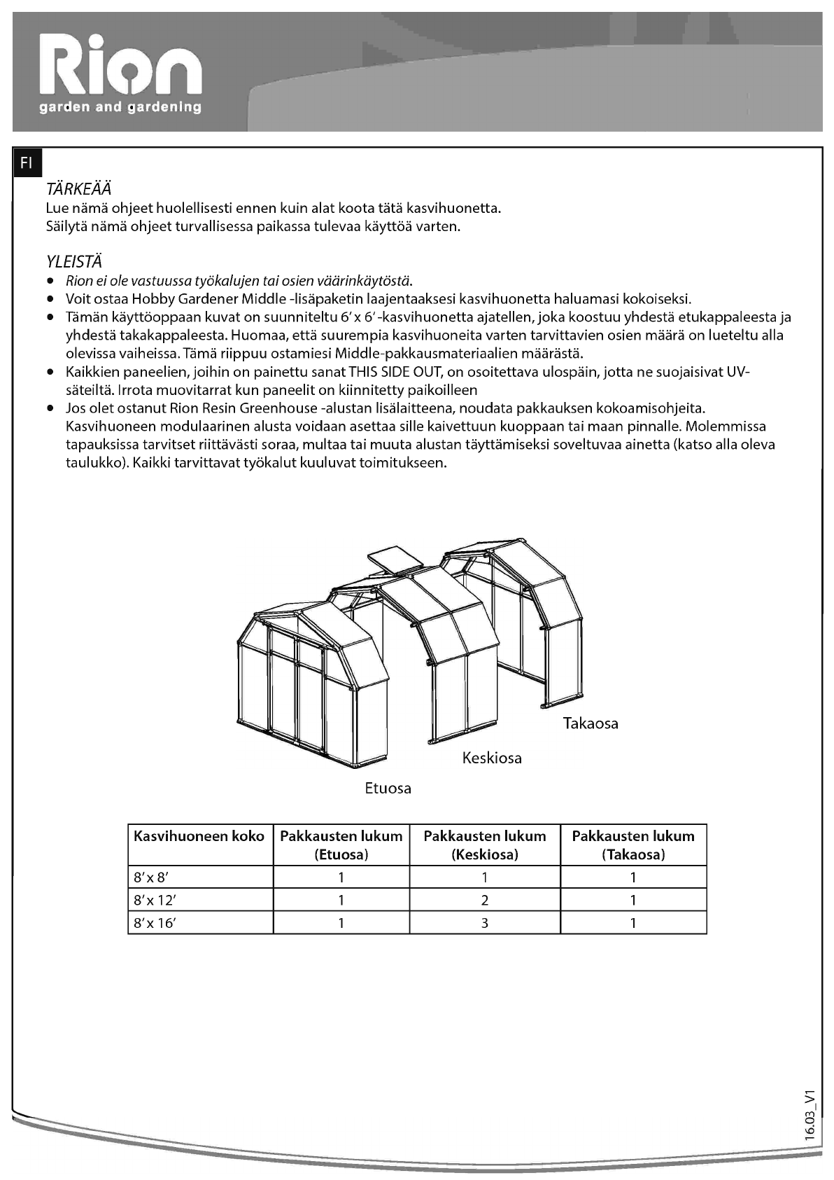 Taman kayttooppaan kuvat on suunniteltu 6'x 6'-kasvihuonetta ajatellen, joka koostuu yhdesta etukappaleesta ja