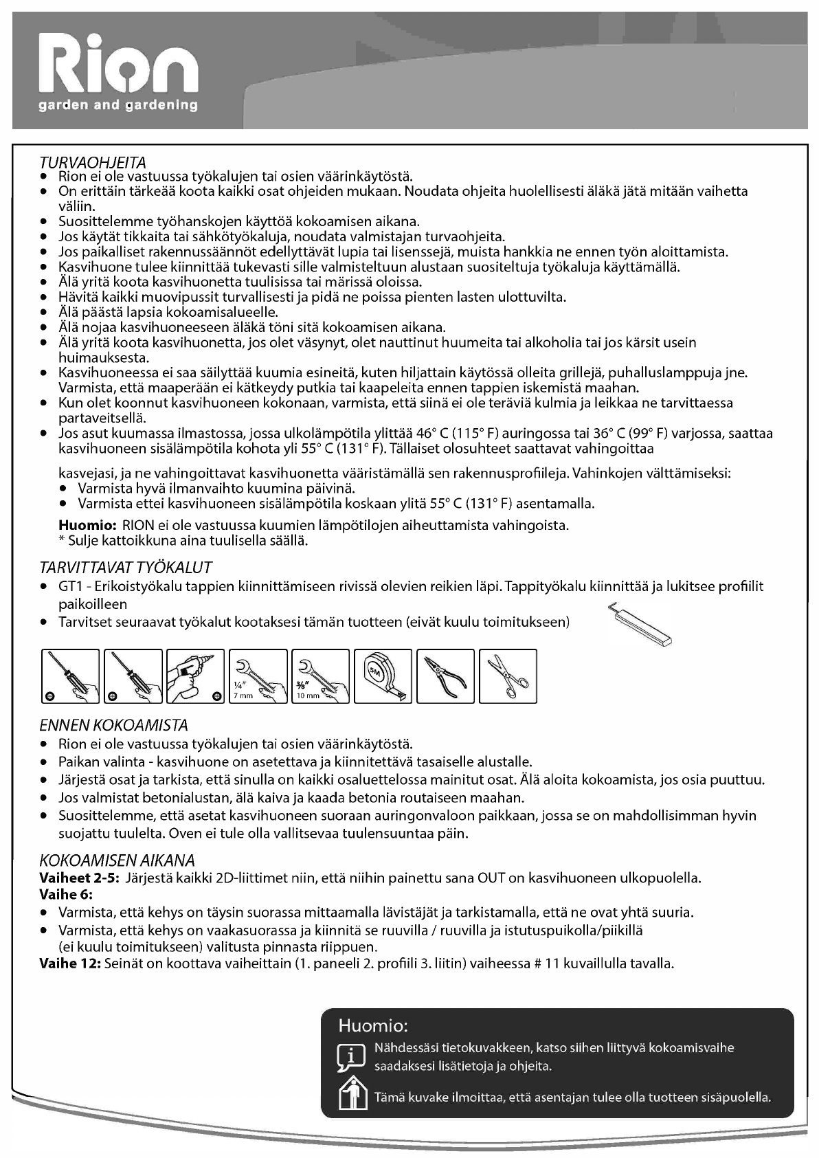 Kasvihuone tulee kiinnittaa tukevasti sille valmisteltuun alustaan suositeltuja tyokaluja kayttamalla.