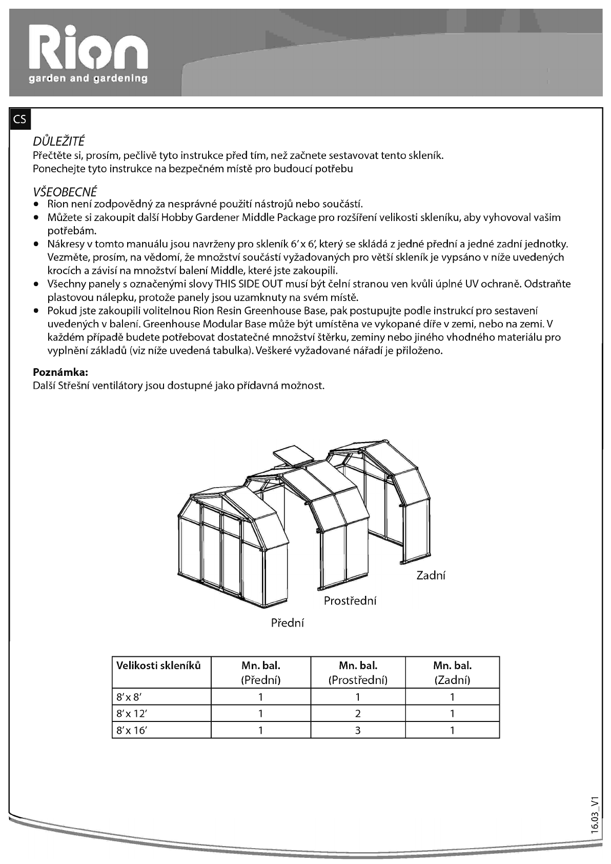 Nakresy v tomto manualu jsou navr2'eny pro sklenik 6'x 6', ktery se sklada z jedne pfedni a jedne zadni jednotky.