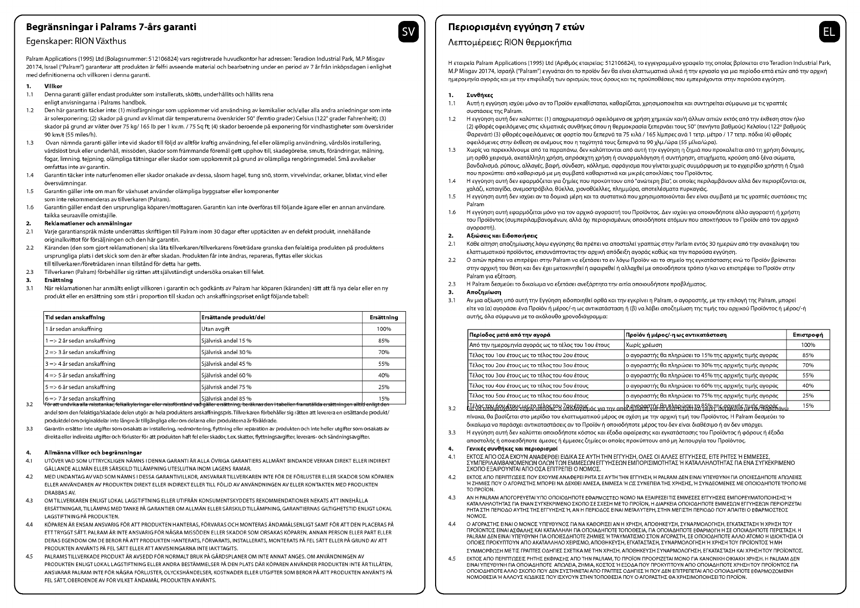 20174, Israel ("Palram") garanterar att produkten ar felfri ayseende material och bearbetning under en period av 7 Sr fran inkopsdagen i enlighet