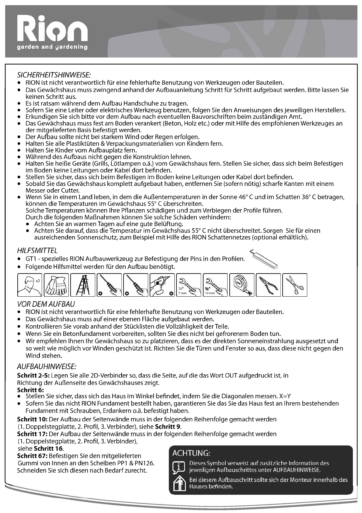 Das Gewachshaus muss zwingend anhand der Aufbauanleitung Schritt fur Schritt aufgebaut werden. Bitte lassen Sie
