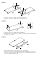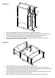 STEP 1 A A A A A A A A 2 3 1. Insert 4 cam bolts (A) into cam bolt holes on left side panel (2). 2. Insert 4 cam bolts (A) into cam bolt holes on right side panel (3). STEP 2 I L A A A I L I L A 1 1. Insert 4 cam bolts (A) into cam bolt holes on top board (1). 2. Attach 2 brackets (L) to top board (1) by inserting 2 screws (I) through holes on brackets (L), then tighten to top board (1). STEP 3 8 C C 7 F F 1. Insert 2 wood dowels (C) into wood dowel holes on bottom shelf (8). 2.