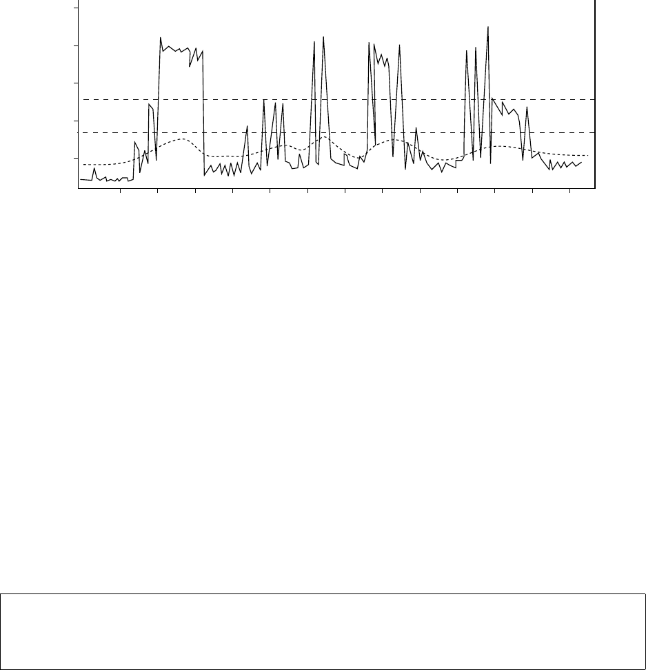 example, notice in Figure 26-1 that while the traffic (solid line) bursts at times, the average queue size (dotted curve)