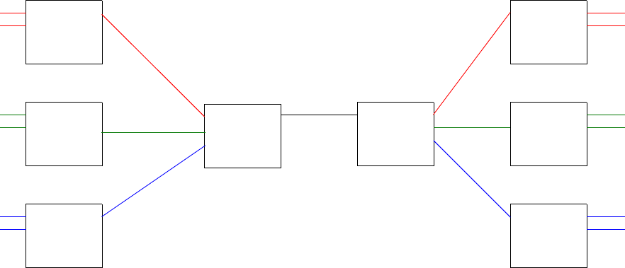 VLAN BLUE on ports et.3.1- 3.3 on R3, and on et.6.1 - 6.3 on R8.