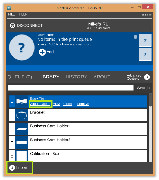 • To add an object to your print queue, simply hover over the item and click “Add to