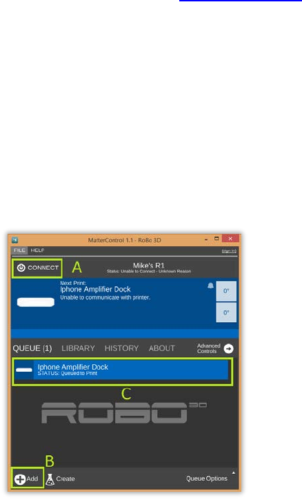 • Once you have your file ready to go, open up MatterControl, connect to your printer