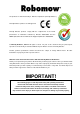 To register your product on-line, go to http://robomow.com/register Robomow Hotline AT. BE. CH. CZ. DE. DK. FR. LU. NL. NO. SE. ® 0664/180.88.09 070.660.124* 0900.888.101*** 800.909.898 09005.7626669** 7025.2303 0892.230.199* 0900.4300.4090* 0900.762.6669* 4000.7719 0771.895.895 Max € 0.35 p/m. * Werktags von 9-12 und 13-16 Uhr 0,59 € pro Minute aus dem ** deutschen Festnetz. Die ersten zwei Minuten sind kostenfrei. Die Mobilfunkkosten können abweichen. *** 0-5 Min.= CHF 0.08/Min. ab/à partir de 6.Min.