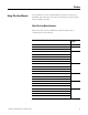Chapter 4 Communication Let’s look at the Date and Time table as an example. • • • • • • • • CSP file number: N11 Remote I/O BT length: 12 CIP assembly instance: 6 (Write) or 7 (Read) Data table name: Date and Time Data access: Read/write Number of elements: 8 Data type: Integer User-configurable: No The power monitor data tables are listed in Appendix A. The table on page 188 shows a summary of all the data tables.